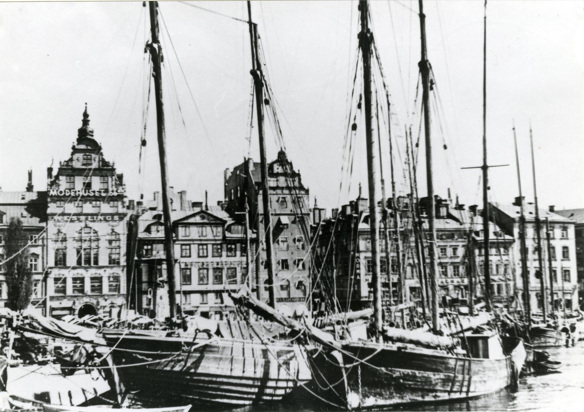 Estlandssvenska skutor liggande vid Kornhamnstorg i Stockholm 1938. I förgrunden t.v. galeasen Södern, t.h. galeasen Freja.