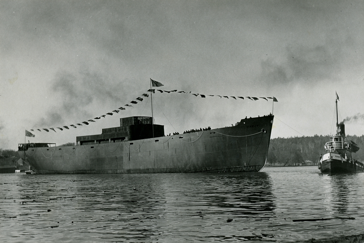 Finnboda varv, Stockholm. M/S FREJA sjösättning den 23 mars 1938. Rederi AB Svea.