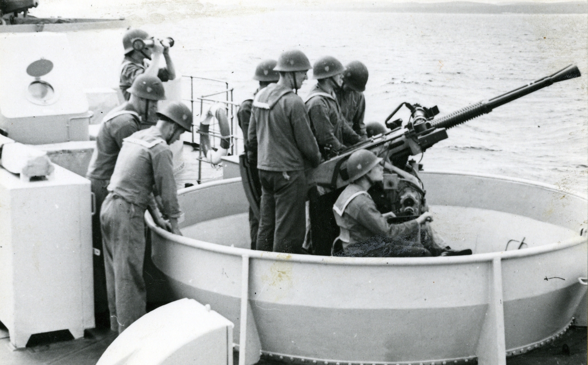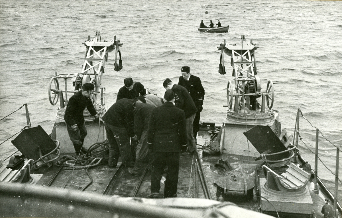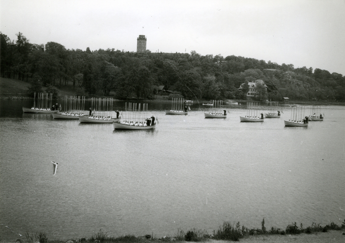 Roddbarkasser med resta åror i Djurgårdskanalen utanför Sjöhistoriska museet, 1947.