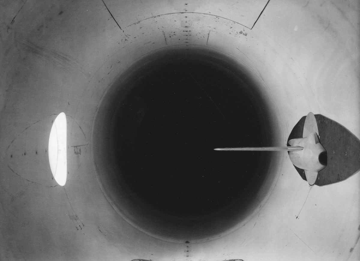 Prov av vindtunnelmodell - halvmodell av flygplan Saab J 29 i höghastighetstunnel på Flygtekniska försöksanstalten.