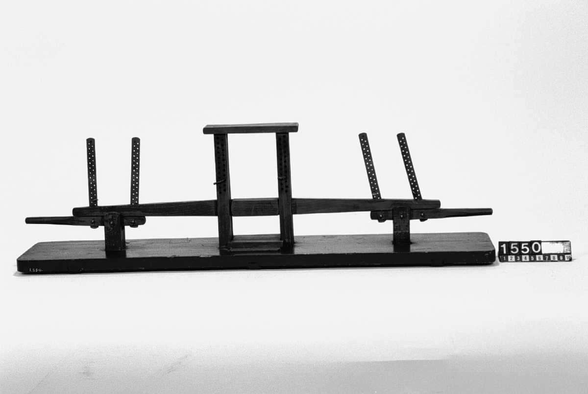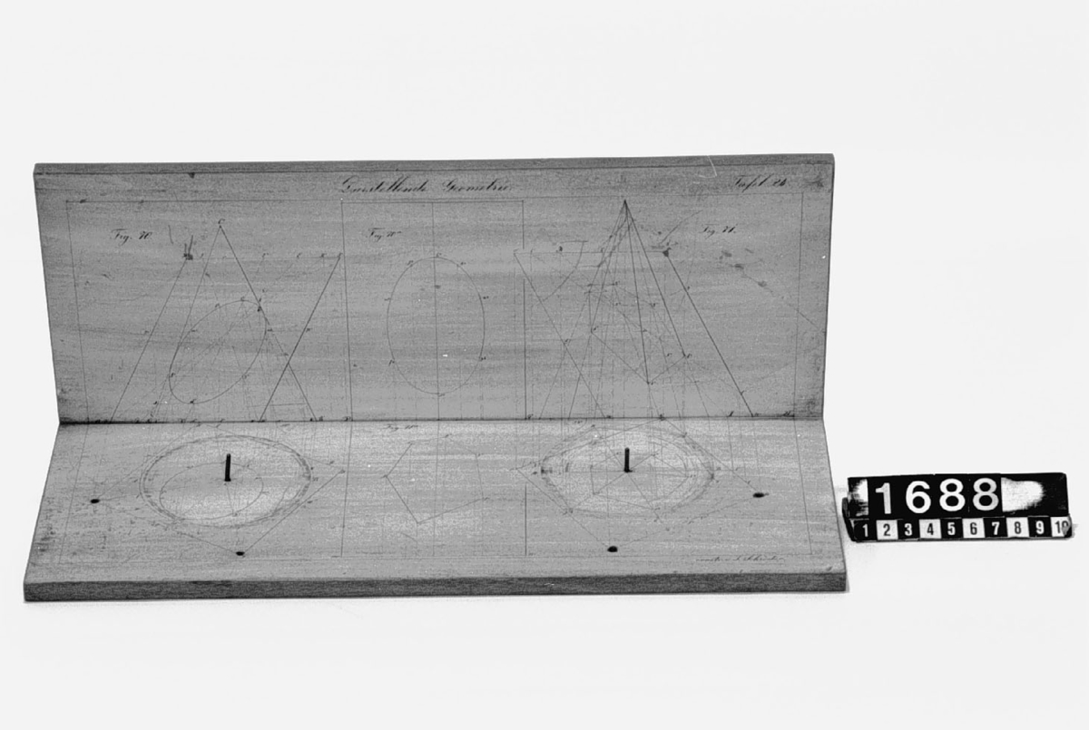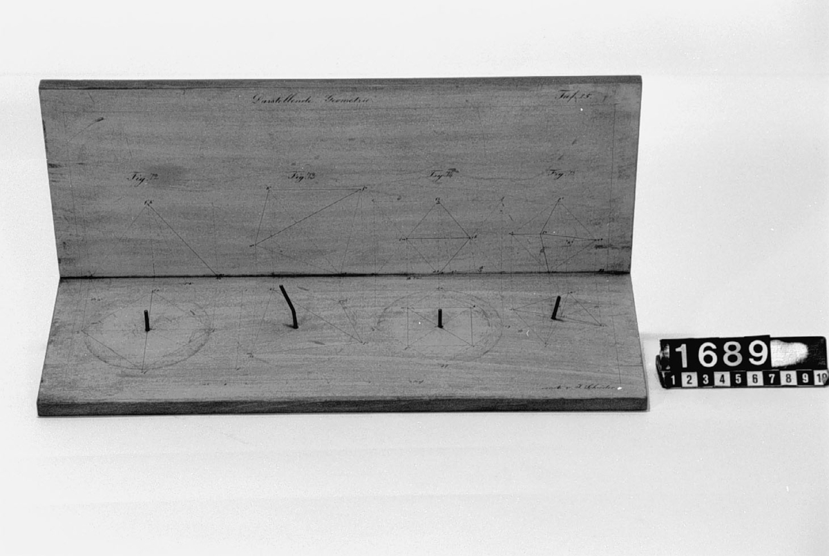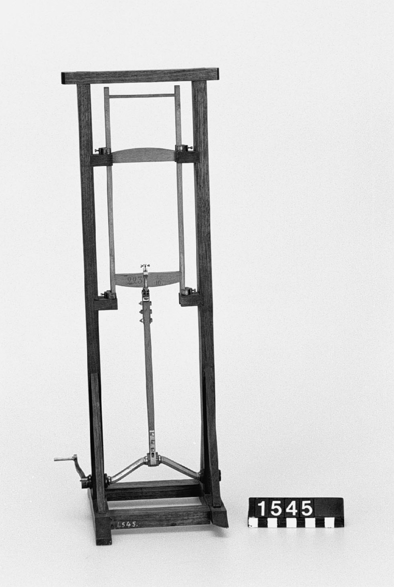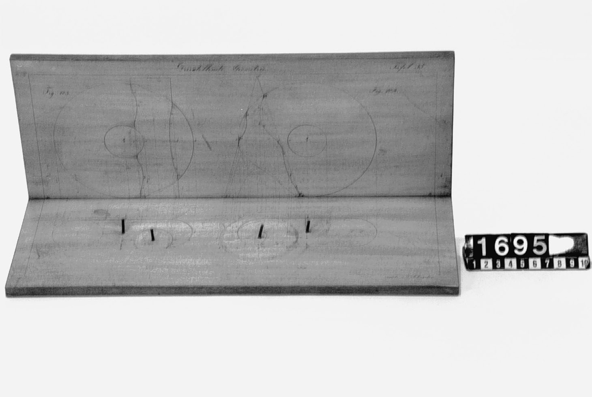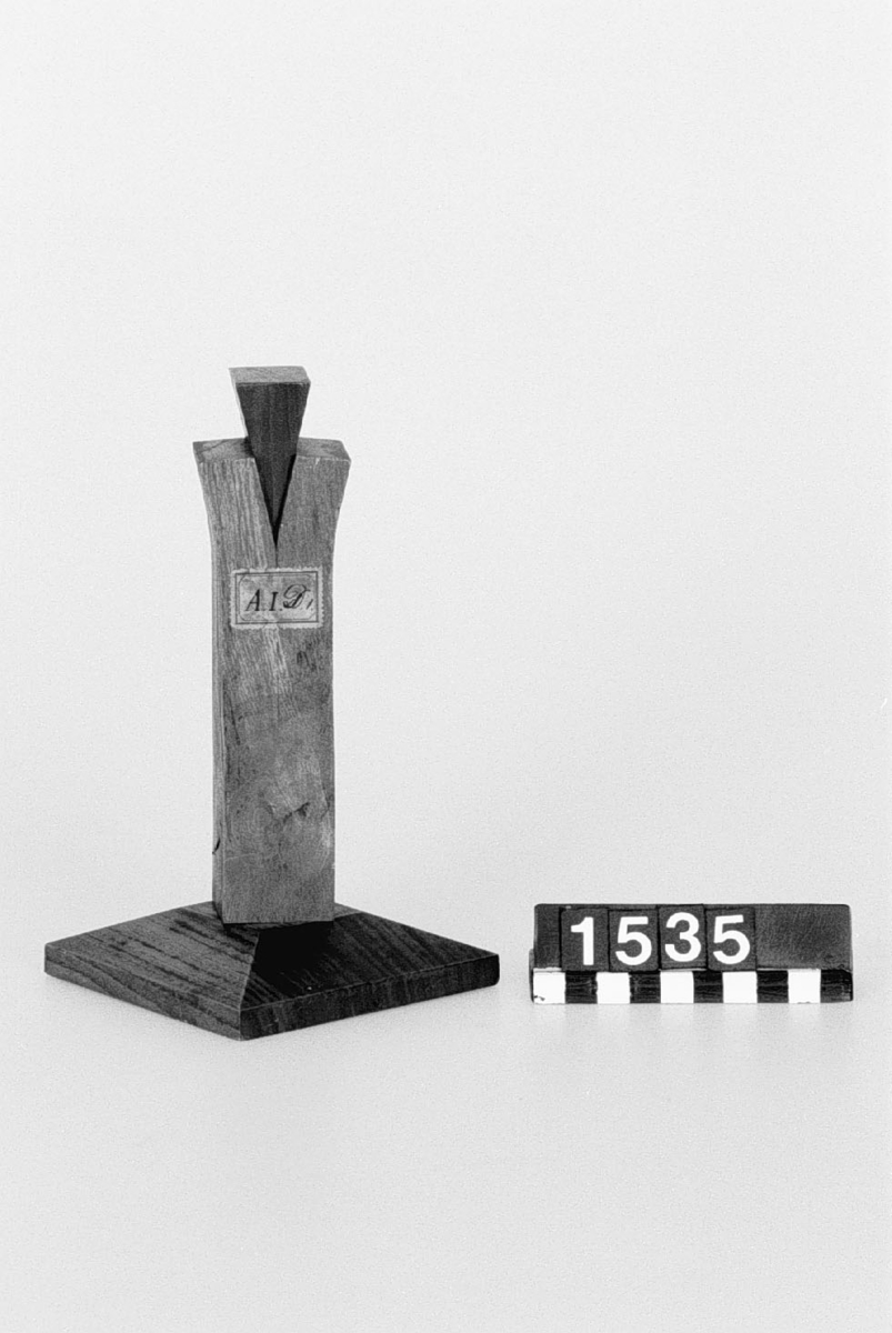 . Wooden rack with space to hold up to three telescopes and a wooden shelf above. The rack would have been attached to a wall or partition.
