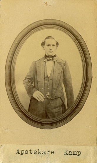 Text på kortets baksida: "Apotekare Carl Fredrik Kamp. Född den 10 mars 1810 död 8 okt. 1859".