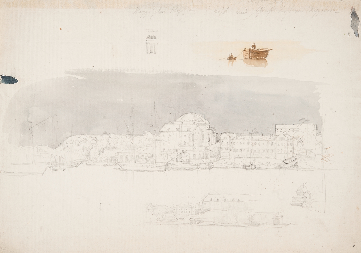 View of Greenwich Hospital and the River Thames at Greenwich. An atmospheric, almost monochrome wash drawing over pencil, looking from beside the north front of the King Charles Court eastward along what is now Admiral's Walk. The opening of the Gran