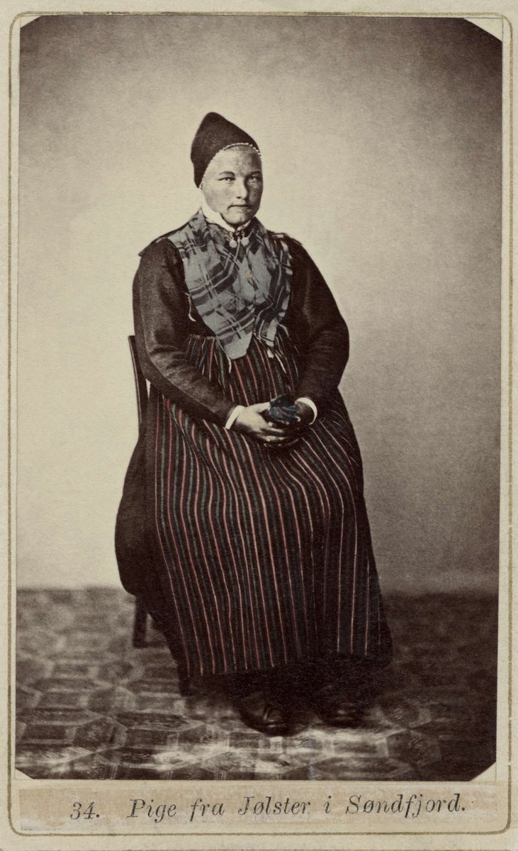 Pige fra Jolster i Sandfjord." En kvinna i Norsk sockendräkt