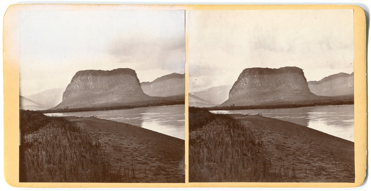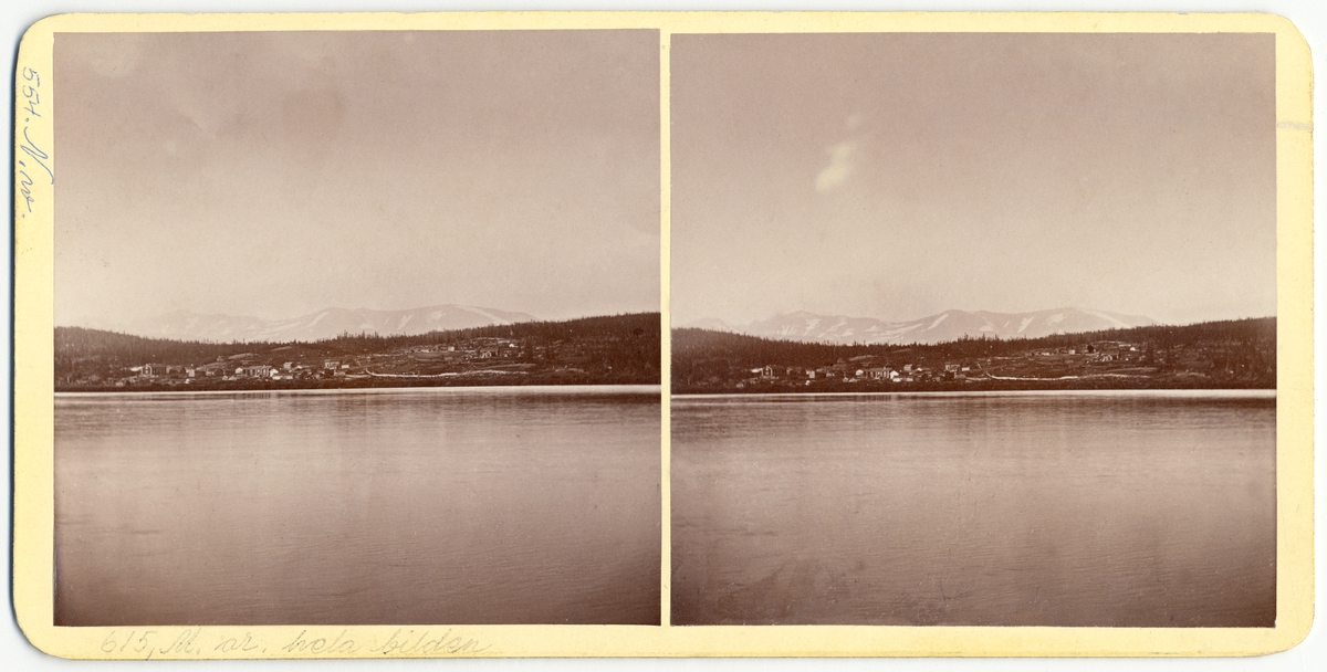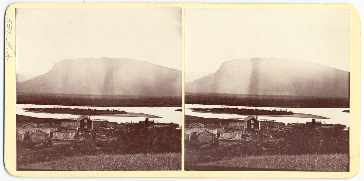 Stereoskopbilder med vy över Lappländskt landskap. Några byggnader i förgrunden, troligen Klockargården. I bakgrunden Tarras och Kamajokkforsens vatten. En glimt av Saggatsjön med Storholmen. I fonden Lastak.