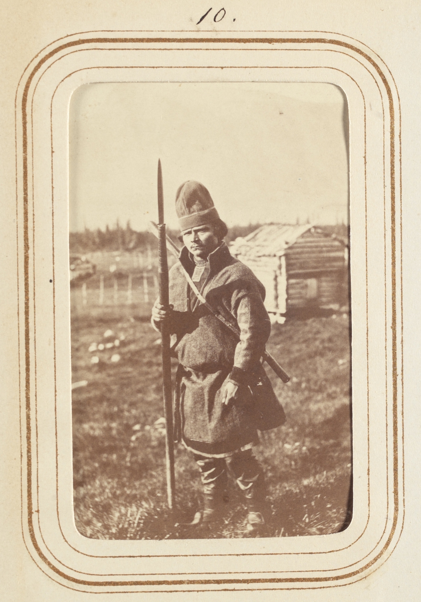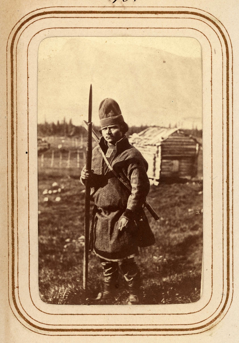 Samisk man med spjut. Per Olof Amundsson Länta, 27 år från Sirkas sameby i Jokkmokks socken. Ur Lotten von Dübens fotoalbum med motiv från den etnologiska expedition till Lappland som leddes av hennes make Gustaf von Düben