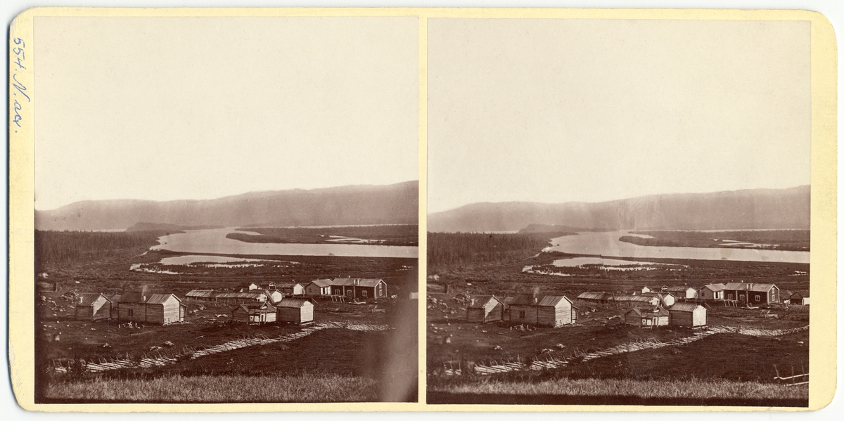 Stereoskopbilder med vy över Lappländskt landskap. Kvikkjokks by sedd från Kålgårdsholmen tvärs över Kamajokkforsen. I fonden fjäll.