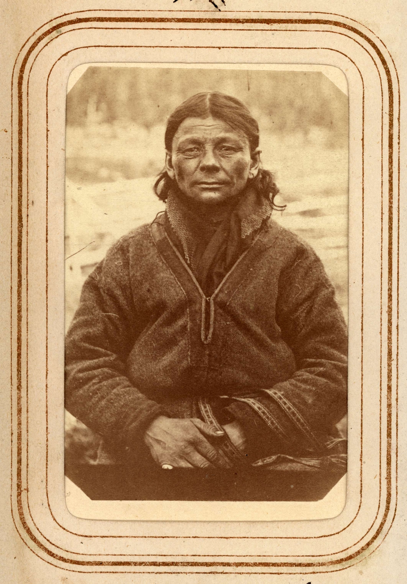 Porträtt av Maria Persdotter Länta, 45 år, Sirkas sameby. Ur Lotten von Dübens fotoalbum med motiv från den etnologiska expedition till Lappland som leddes av hennes make Gustaf von Düben 1868.