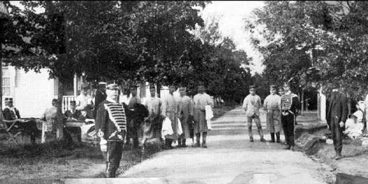 Gata i husarlägret Sanna Hed. Närmast kameran ryttmästare Nils Stedt på Livskvadron.