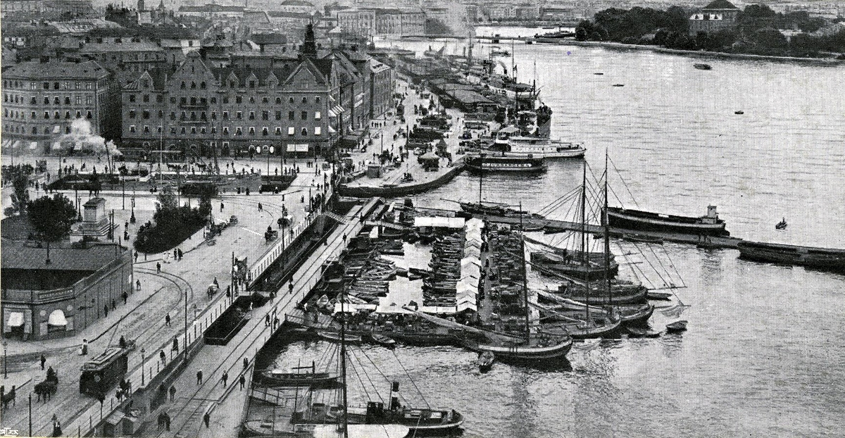 Bilden visar i förgrunden magasin efter Selångersån och i vänster hörn Storbron, Stadsbacken och Villa Ludvigsberg. Text på vykortet "Maria Kihlbaum Sundsvall Storgatan 33."