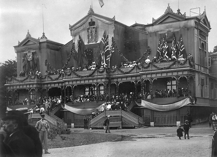Oscar II har just anlänt till Marstrand. Kung och uppvaktning är på väg upp mot Societetshuset. Kungens byst på planen, är smyckad med blomstergirlander.