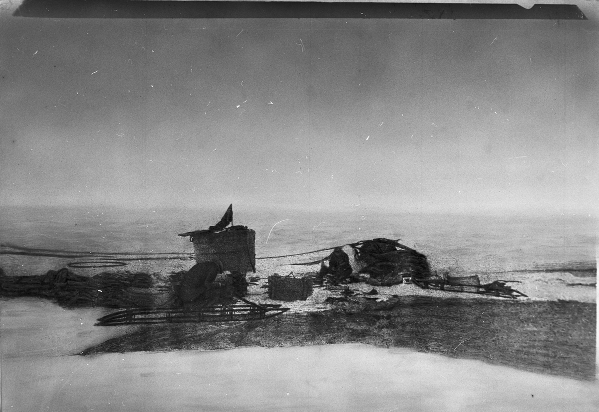 Lägret vid "Örnens" landningsplats. Kälkarna monteras. Framtagning av bilderna gjordes av docent John Hertzberg år 1930 på Fotografi, Tekniska Högskolan.