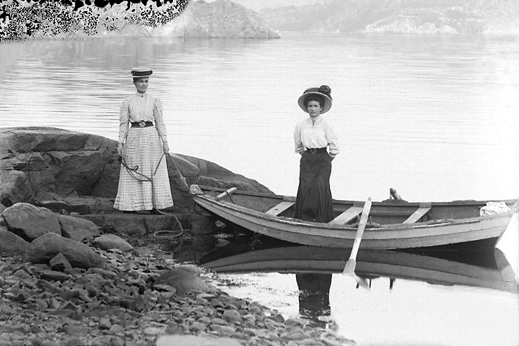 En eka ligger vid stranden till en havsvik. På land står en kvinna och i båten står ytterligare en kvinna. Båda kvinnorna bär hatt. I bakgrunden syns land på andra sidan viken.