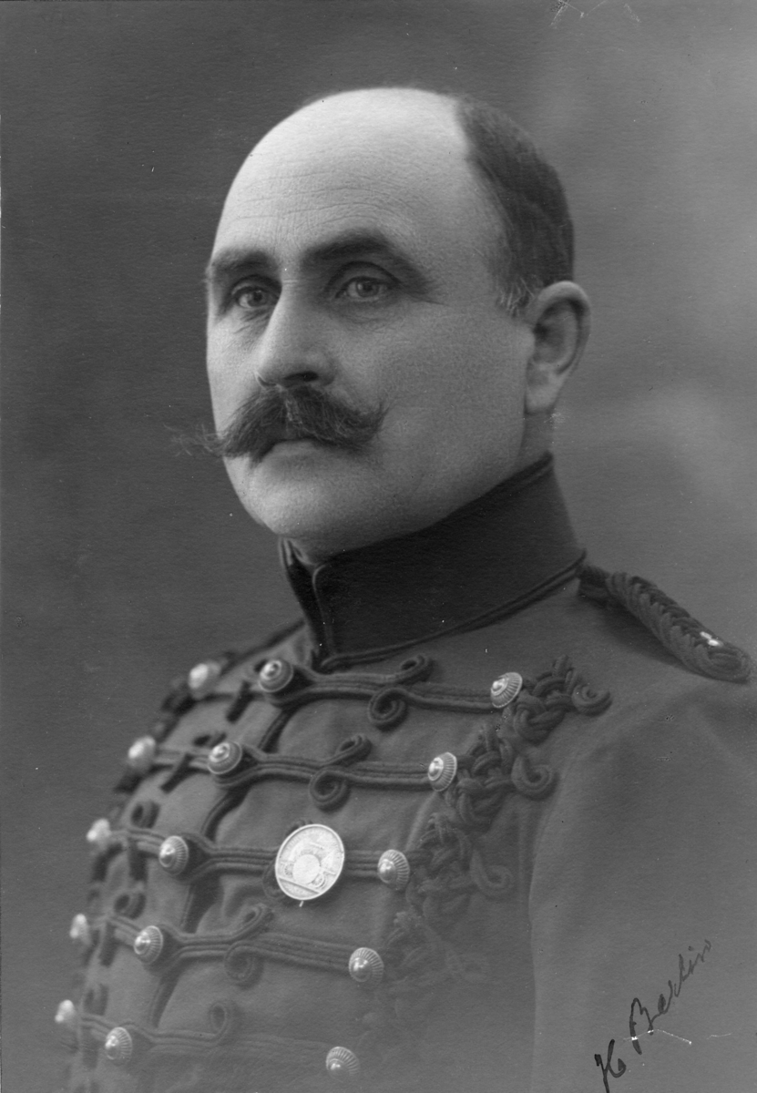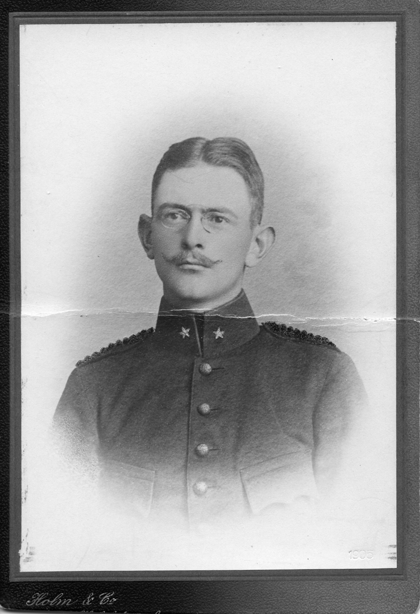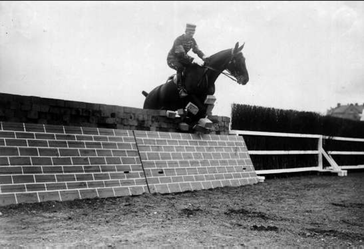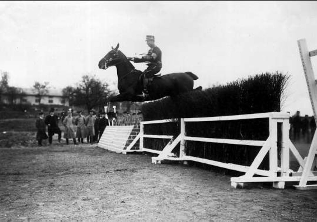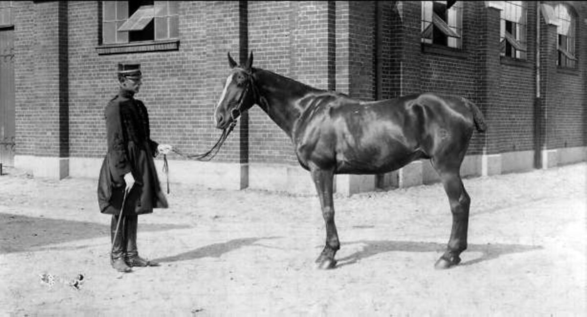 Lt Ragnar Aaby-Ericsson med egna tjänstehästen "Lodestar xx " utanför stallet på K 7 i Malmö. Strömsholm 1910-11.