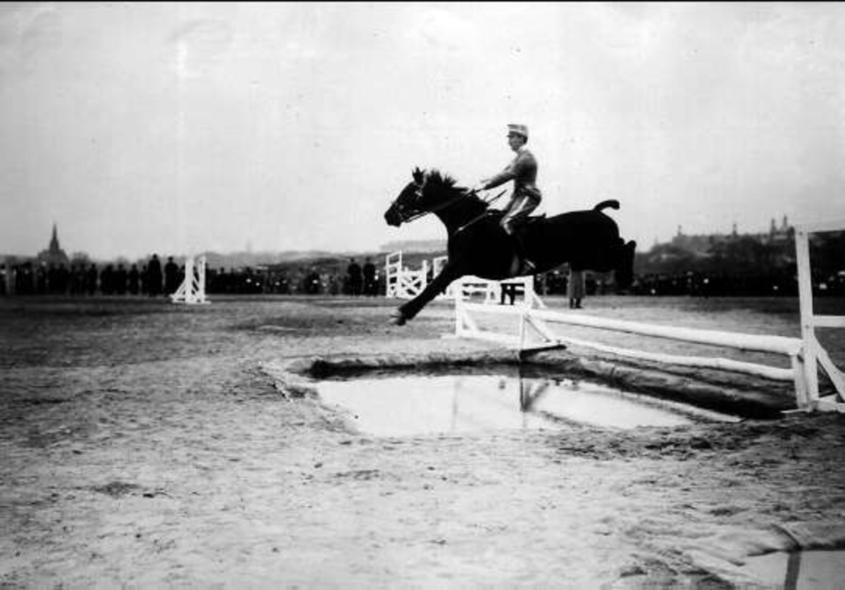 1. årseleverna på Strömsholmskursen på tävlingsresa till Stockholms fältrittklubbs tävlingar på Gärdet i Stockholm. Strömsholm 1910-11.