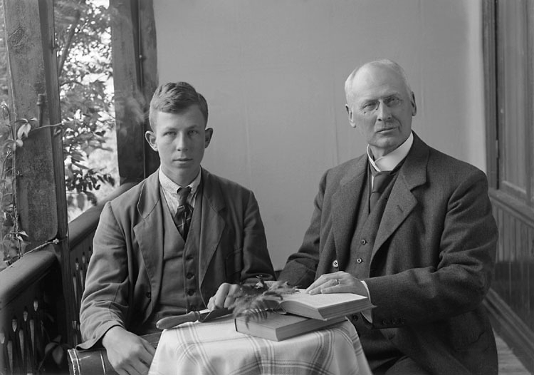 En äldre och en yngre man sitter vid ett bord med några böcker, på en veranda.