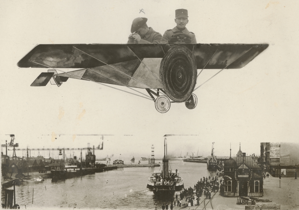 Bildmontage med två soldater som flyger över hamn med ett flygplan.