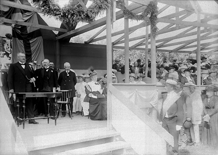 Enligt tidigare notering: "Hederstribunen på Margretegärde vid jubileumslantbruksmötet 1914. Till höger om bordet landshövdingen Friherre Gustaf Lagerbring, f. 1847 d. 1921."