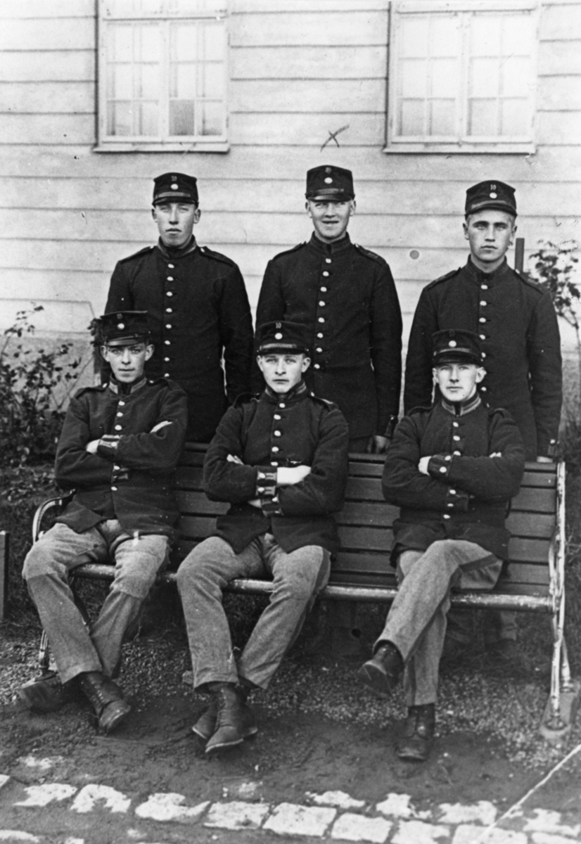 Gruppbild med soldater från Södra skånska infanteriregementet I 25 framför en byggnad.