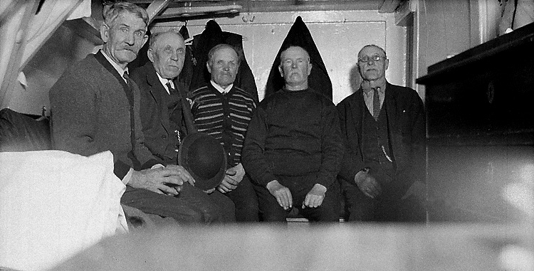 Fem gamla båtsmän ombord på logementsfartyget "Norrköping".