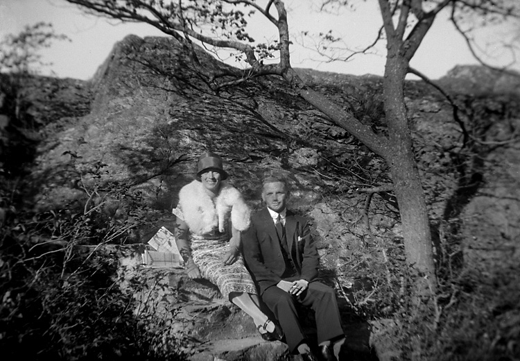 Erik Augustsson med okänd dam i hatt, sitter i Marstrandsbergen.