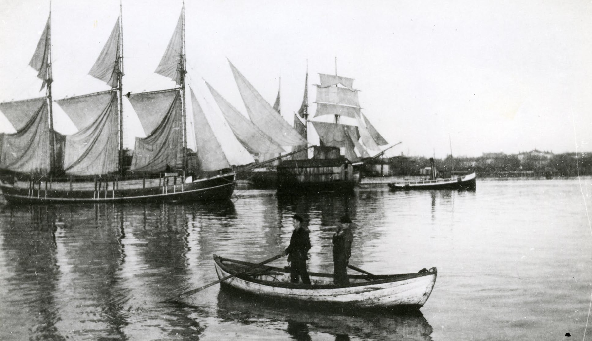 Hudiksvalls hamn 1925. I förgrunden en eka och i bakgrunden en 3-mastad slättoppad skonare samt ett 3-mastat skonertskepp.