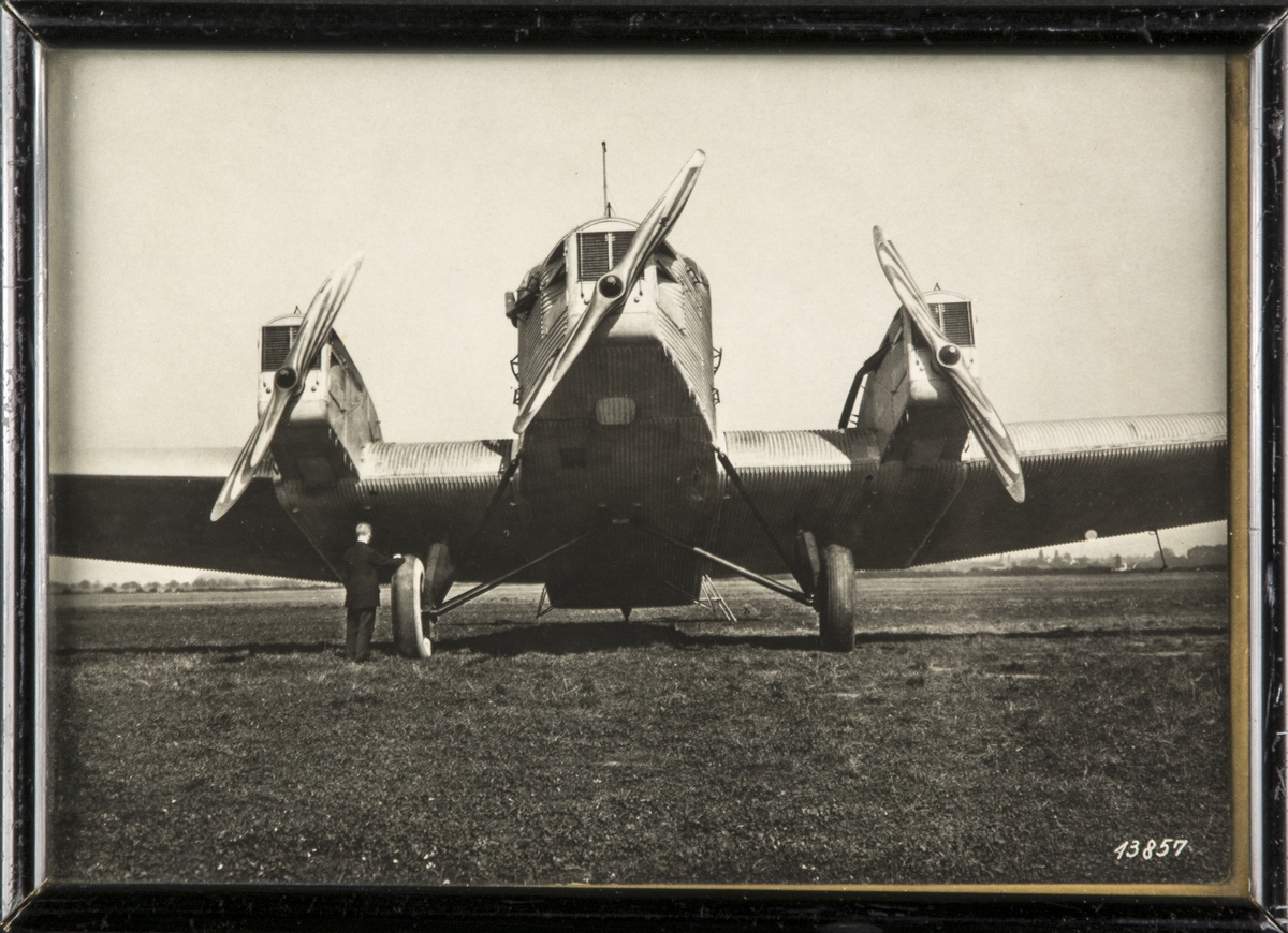 Ett civilt flygplan tillverkat av Junkers står på ett flygfält. Inramat foto.