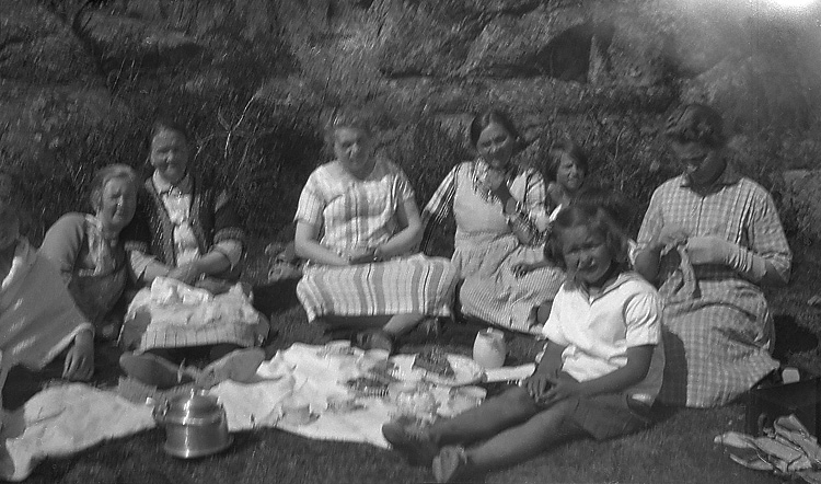 Kaffe i det gröna. En grupp kvinnor och två flickor. Kvinnan till höger stoppar strumpor.