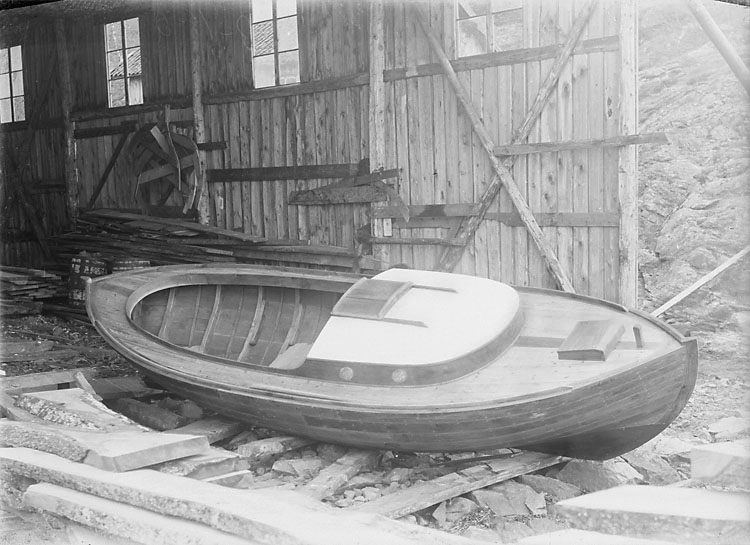 En segelbåt (trol. s.k. koster, utan sin mast) ligger halvt utanför ett båthus med öppna dörrar.