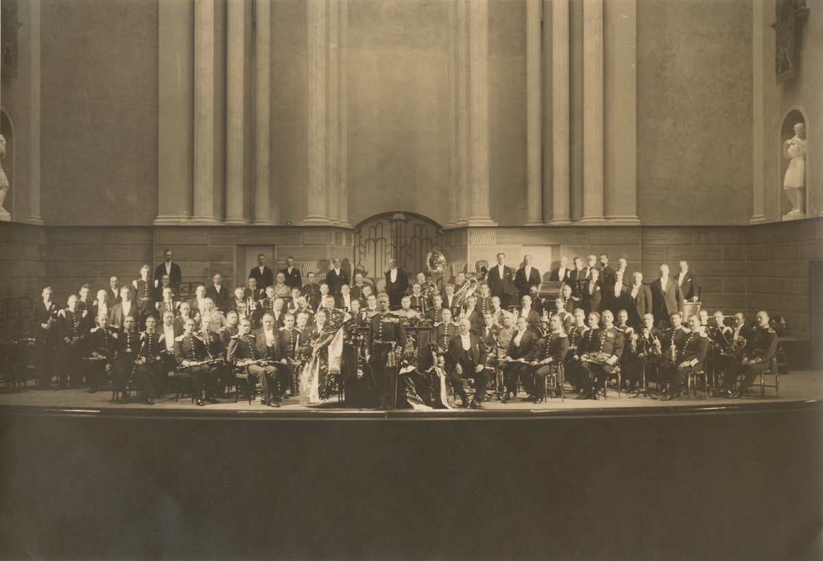 Göta livgardes musikkår c:a 1925. Gruppfoto med musikdirektör Otto Trobäck.