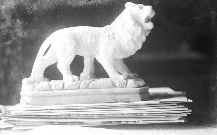 Närbild av större brevpress i form av ett lejon, troligen tillverkad av alabaster.