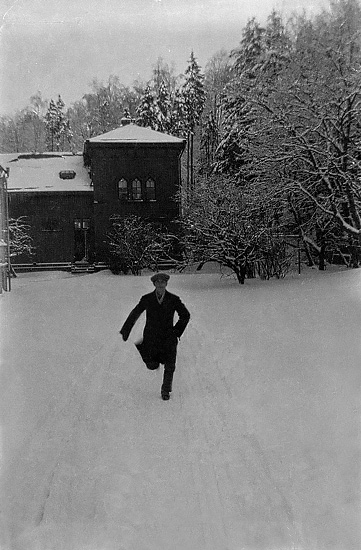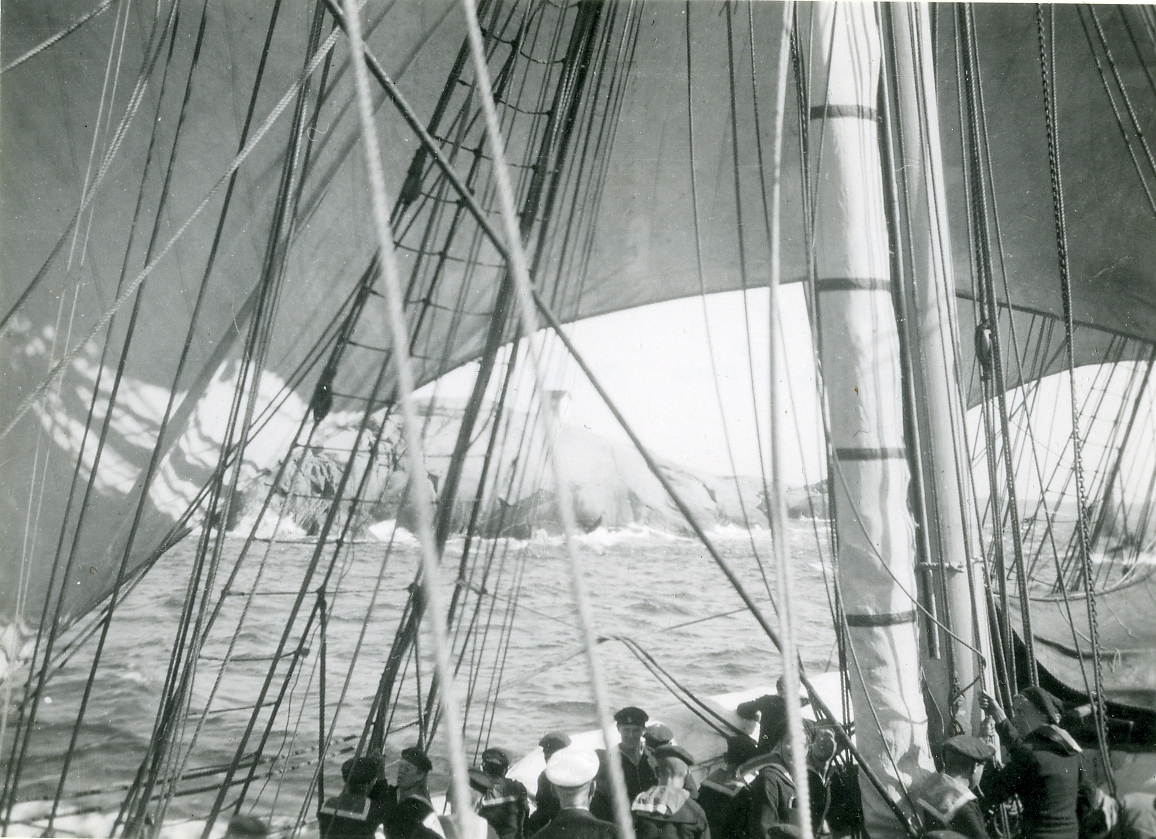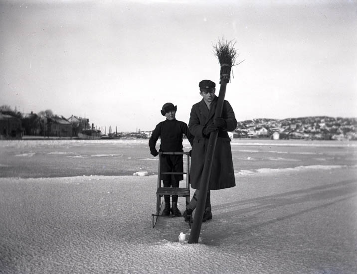Vid packisen, kvasten infrusen (d.v.s. CarlErik Fägersten o. Ingvar C. vid kvasten) och Ingvar på råslandgången. 5 jan. 1928".