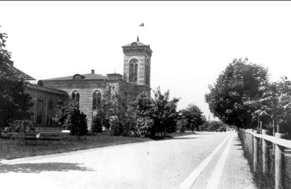 Parad på Gustaf V:s födelsedag 1928. Förbimarsch för platschefen överste Reuterswärd på skolplan framför Eric Ugglas skola. I bakgrunden till vänster milostabsbyggnaden.