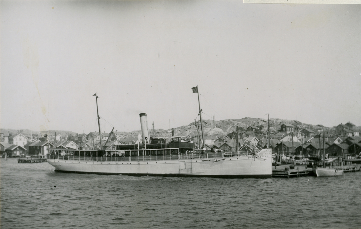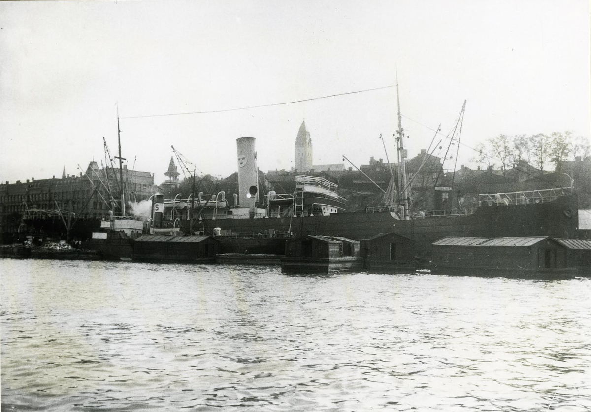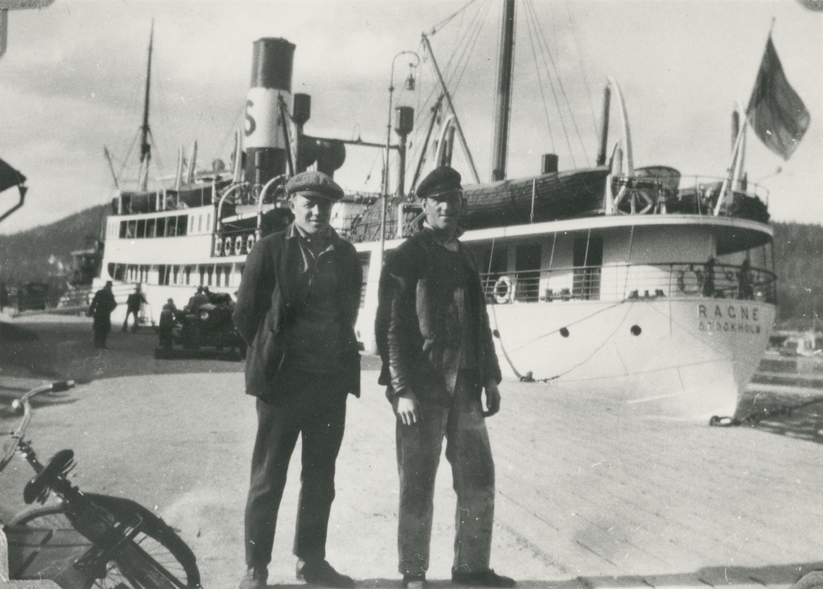 Passagerarångfartyget Ragne av Stockholm vid Stockholmskajen i Sundsvall år 1928. Männen i förgrunden är stuvare från Sundsvall.