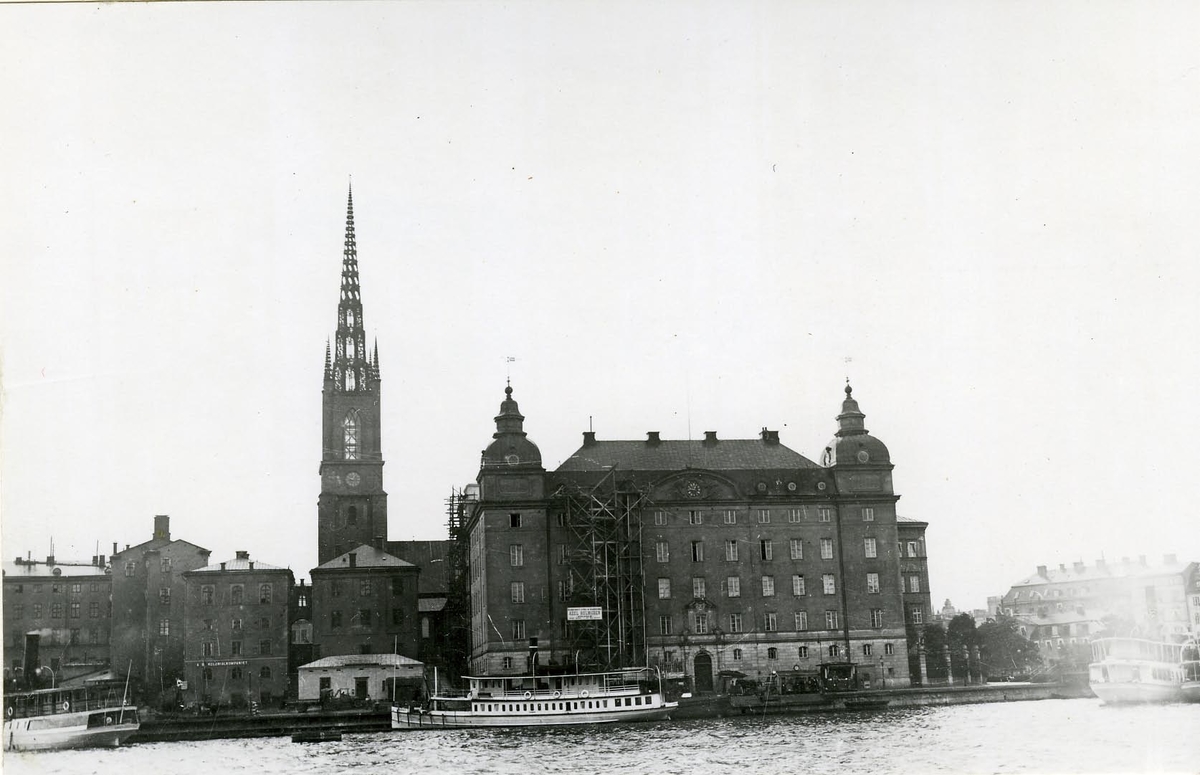 Riddarholmskajen och gamla Riksdagshuset, Riddarholmskyrkans torn, 1928.