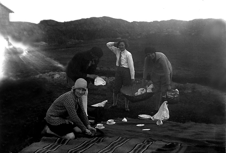 Från vänster: Greta Rasmusson, ...Ivarsson, Stina Andersson och Gertrud Andersson "majar" i naturen vid Lycke, Klåverön.