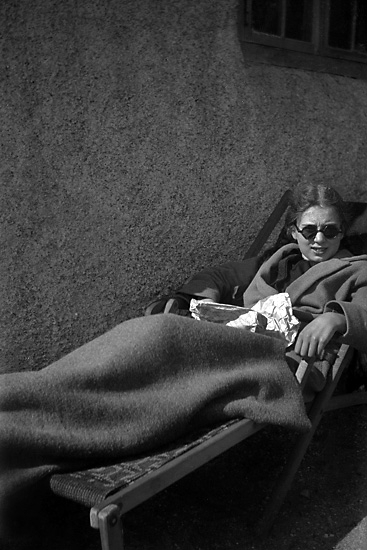 En ung kvinna sitter i en solstol mot en husvägg, fullt påklädd.