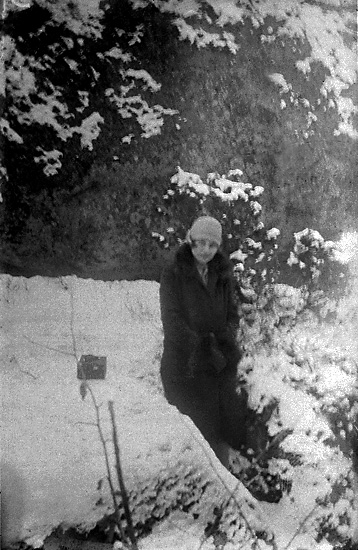 Alvar Nilsson klädd i överrock och hatt, på utsiktsplatsen "Brittania", Backudden.