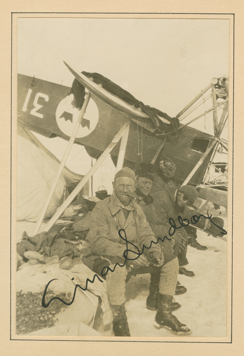 Signerat porträttfotografi av Einar Lundborg och annan besättning strandsatta på isen vid havererat flygplan S 6 Fokker vid Spetsbergsexpeditionen 1928.
