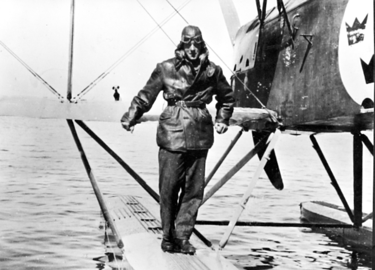 En militär flygare står på flottör på sjöflygplan S 1 vid flygstationen i Karlsborg.