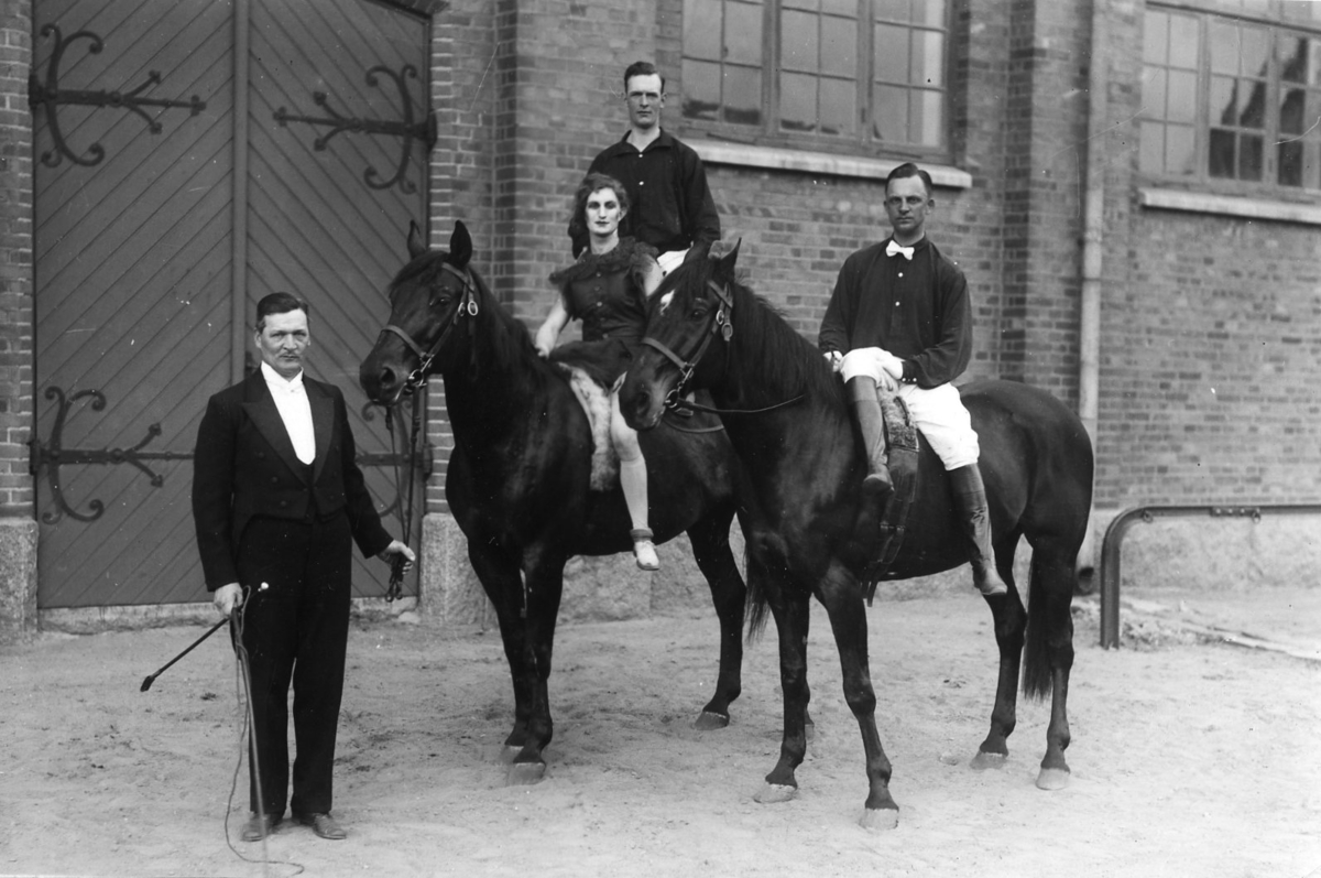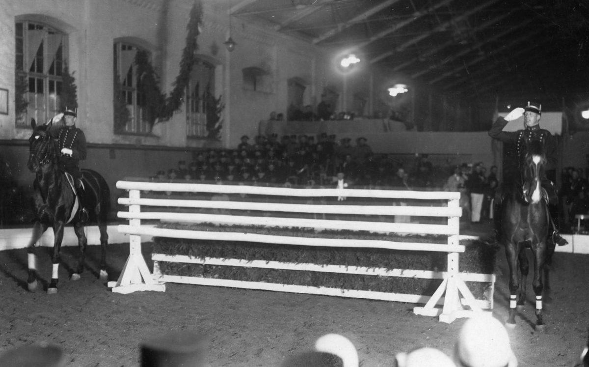 Regementskapplöpningarna 1928 på fältet söder K 3 kasern. Officersjaktloppets deltagare med mastern i täten paraderar för domaren.