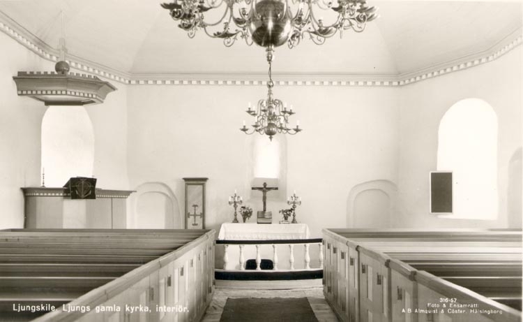 Tryckt text på kortet: "Ljungskile. Ljungs gamla kyrka. Interiör".
