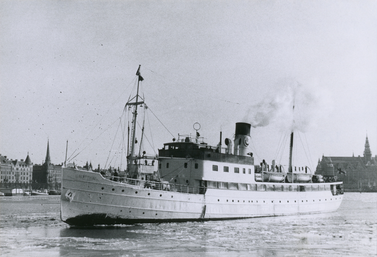 Foto i Svartvitt från omkring 1965 visande passagerarmotorfartyget Ilmatar av Helsingfors, under gång på Stockholms ström.