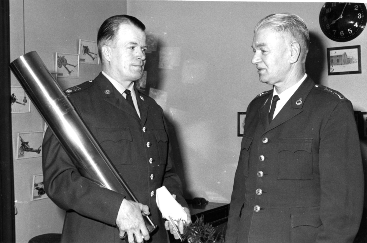 Högtidlunch i Lundasalen 4 dec. Sekundchefen utdelar regementets plakett till befäl som slutat vid regementet under året. Från vänster i bild: Fanj Holmberg, fanj F Karlsson, förvaltare P A Karlström, ryttm G Ulfsparre