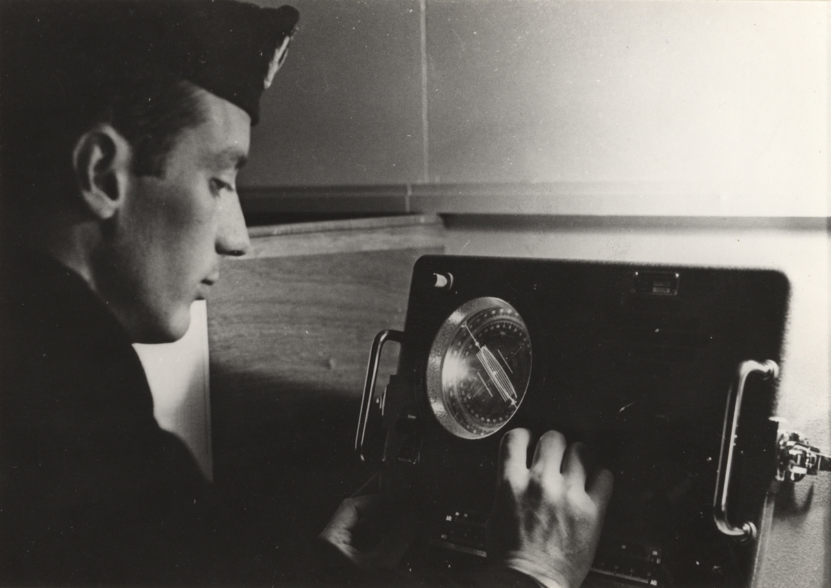 Tredje styrman Bo Eriksson sysslesatt vid radiopejlingsaparaten ombord på m/s NUOLJA av Stockholm.