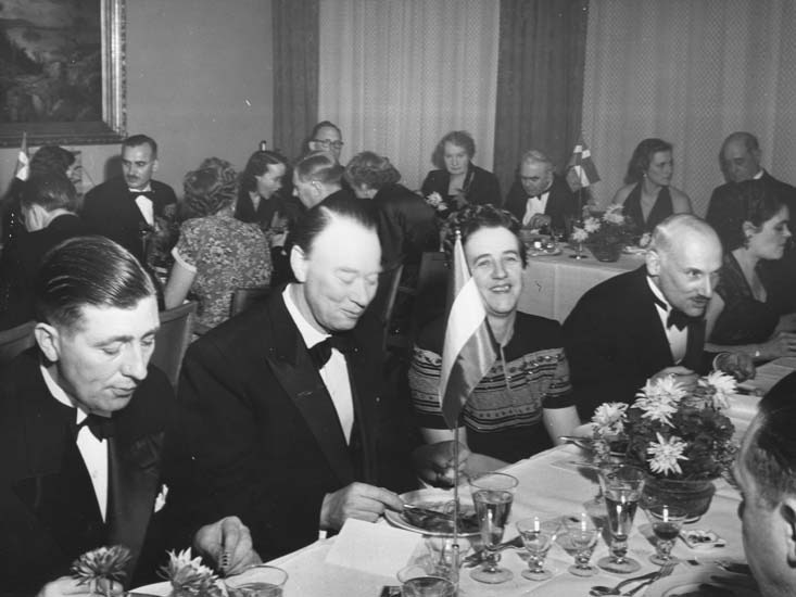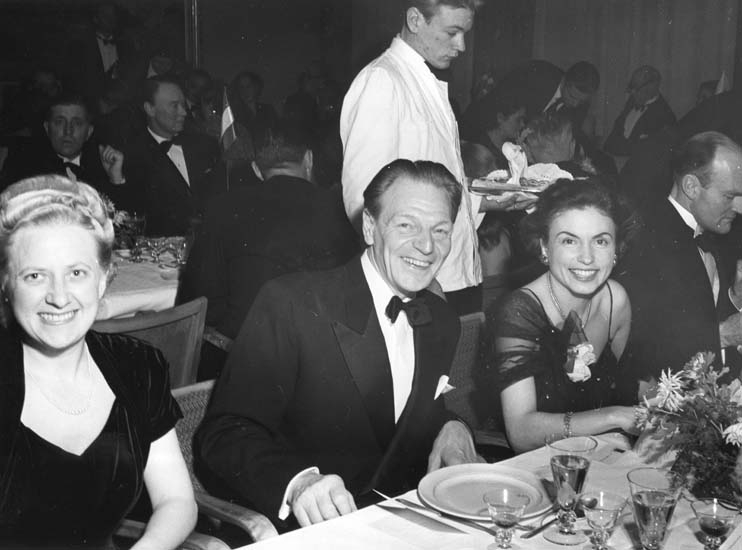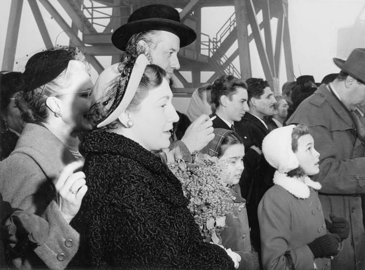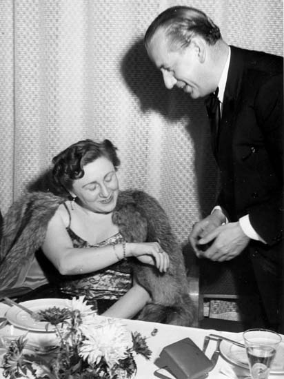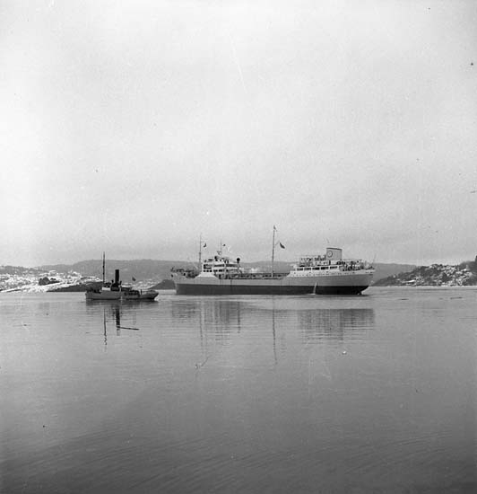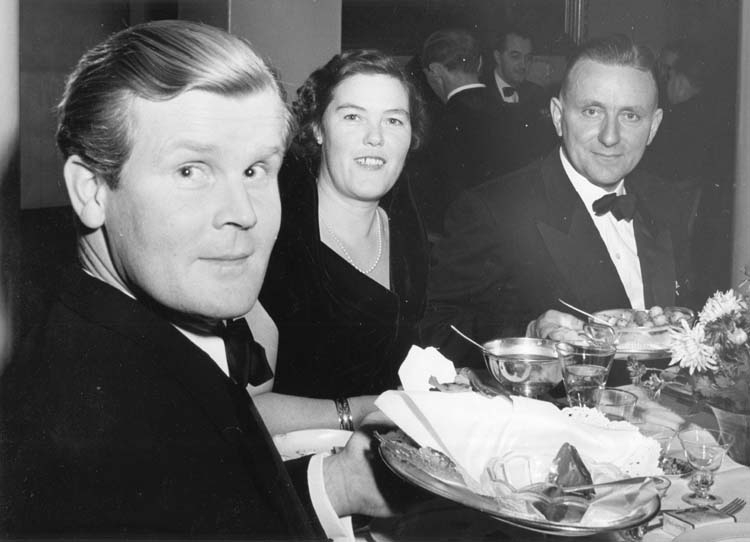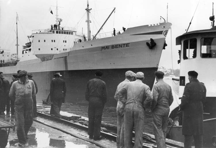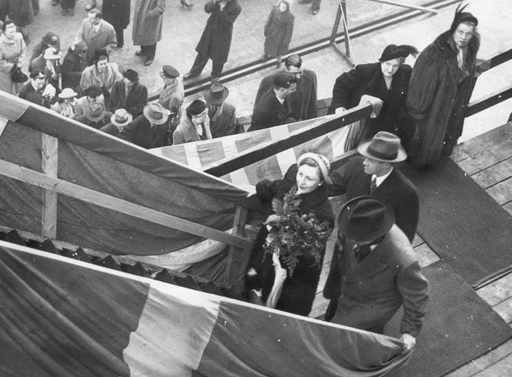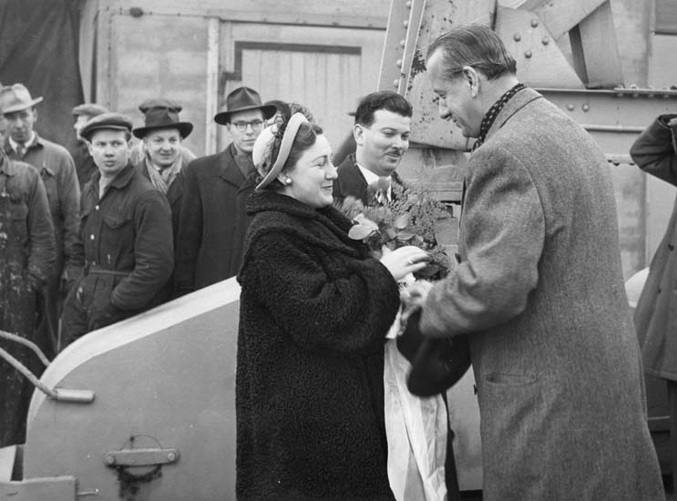 Sjösättning och dop av fartyg 113 M/T Islas Georgias. Fartygets gudmor skakar hand med Uddevallavarvets grundare och dåvarande VD Gustaf B. Thordén.