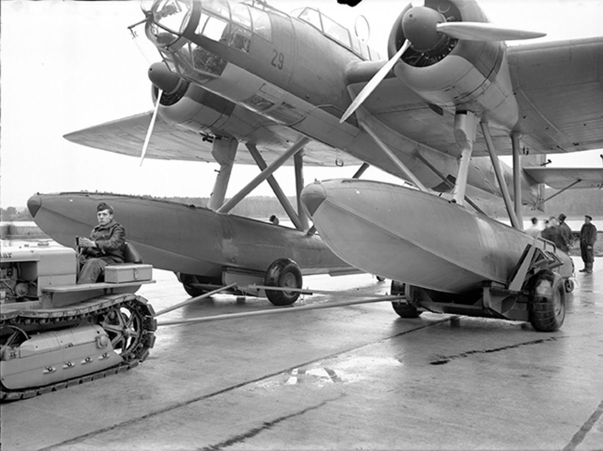 Flygplan T 2 placerad på vagn dras upp på slip vid F 2 Roslagens flygflottilj. Bandvagn i förgrunden.