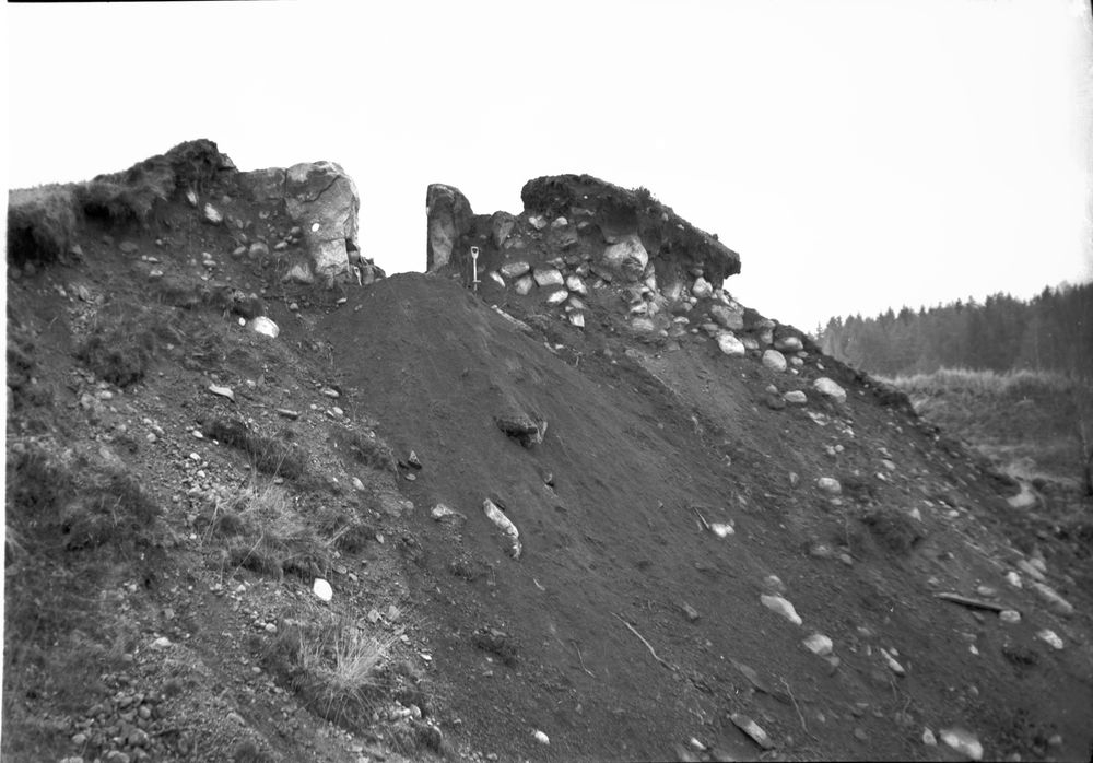 Hällkistan på Ingemarstorp S Härene, sett från grusgropen b-c under utgrävningen.