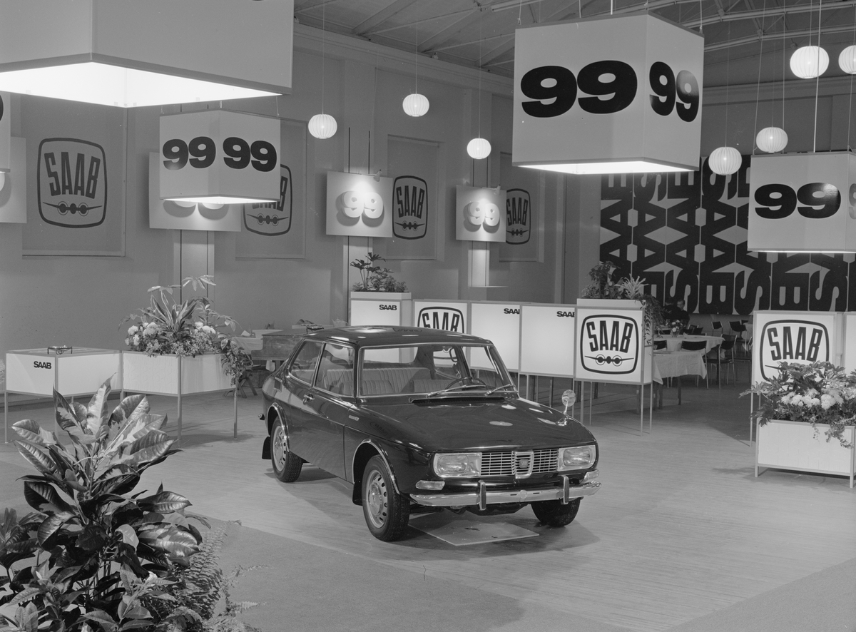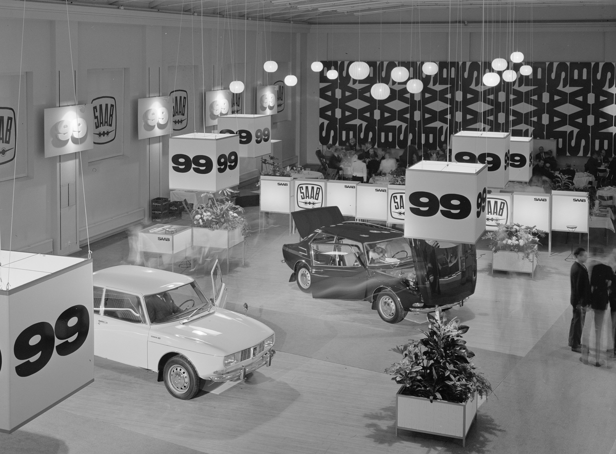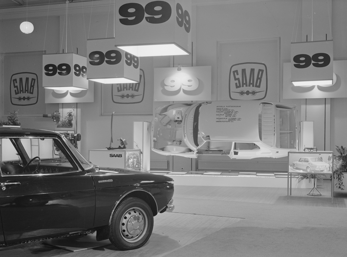 Bild från premiärvisningen av den nya SAAB 99 som ägde rum i Teknoramas hörsal på Tekniska museet den 22 november 1967, kombinerad med en utställning i Wenströmshallen.