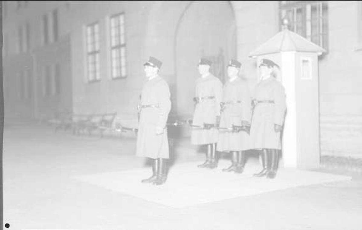 Två vaktmanskap utanför valvet K 3 kasern. Klädsel: Uniform m/ä, kappa m/10 och mössa m /1853 med plym.